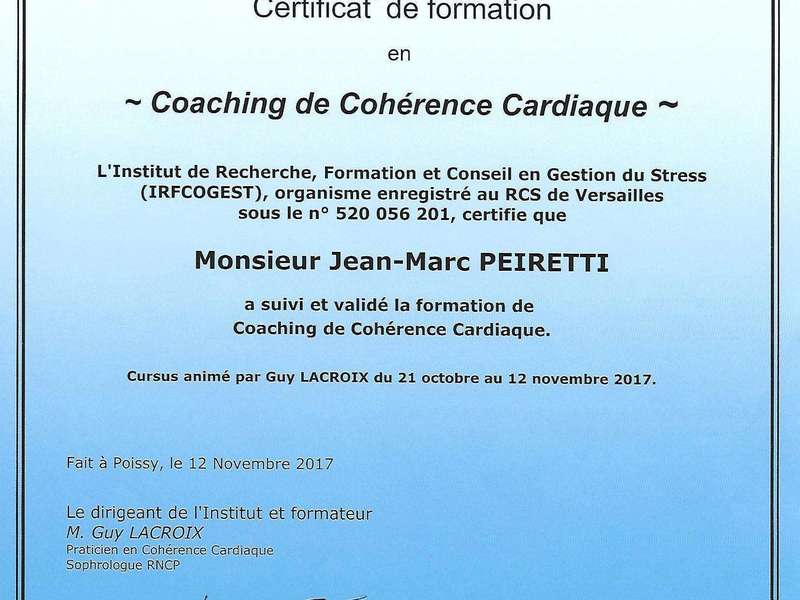 En 2017, Certification de Coach en cohérence cardiaque à l’IRFCOGEST.