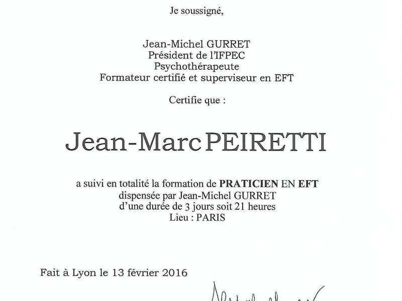 En 2015, formation à l’EFT (Emotionnal Freedom Techniques) pour devenir praticien en 2016 à l’IFPEC (Institut Français de Psychologie Energétique Clinique).
